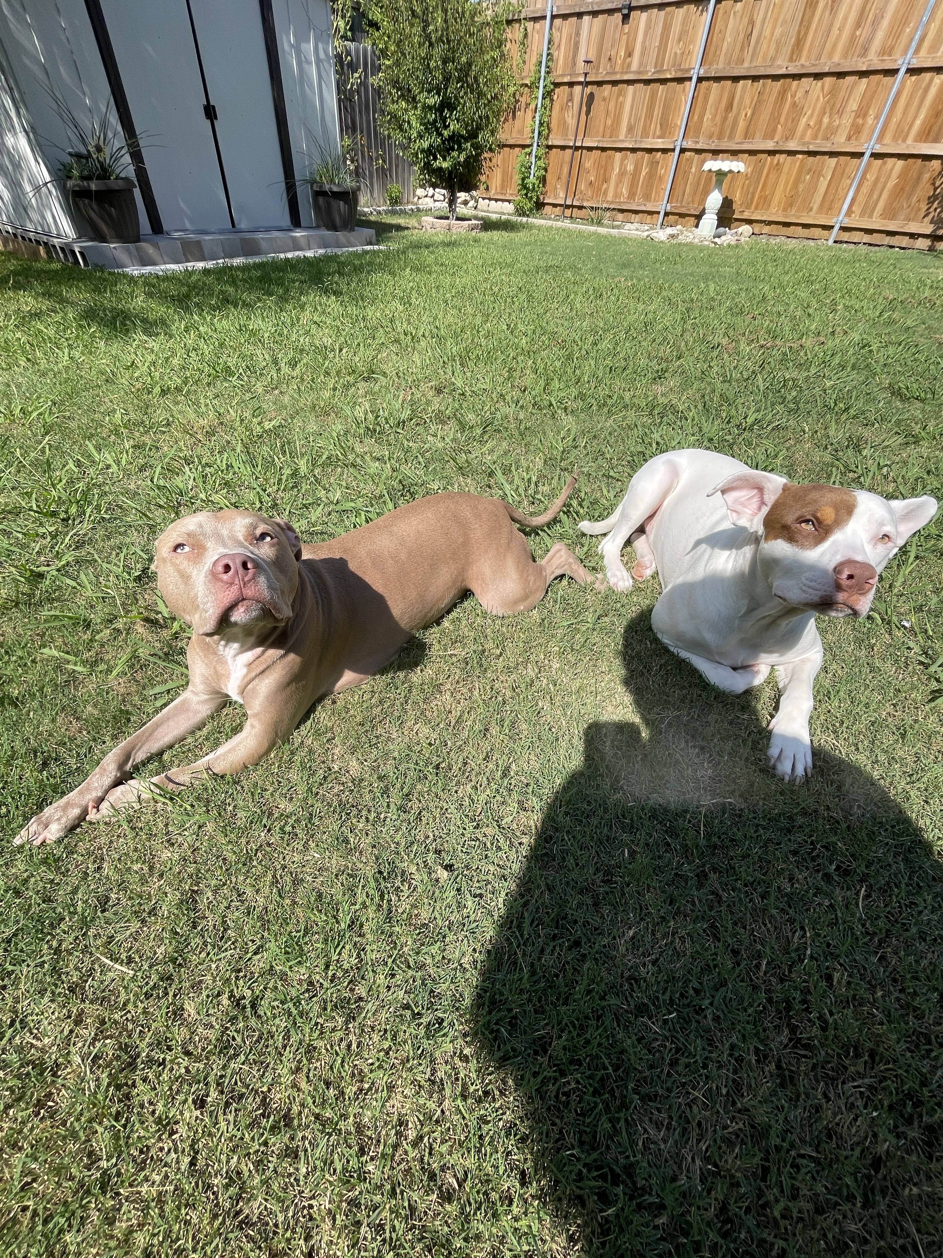 Above are my babies. The brown one on the left is named Camelia and the white one on the right is named Lucky. Camelia is a mix of pitbull and something else (We got her from the shelter so your guess is as good as mine) and Lucky is half pitbull half boxer. They are both absolute demons and can never seem to stop play fighting. Love them both to death.